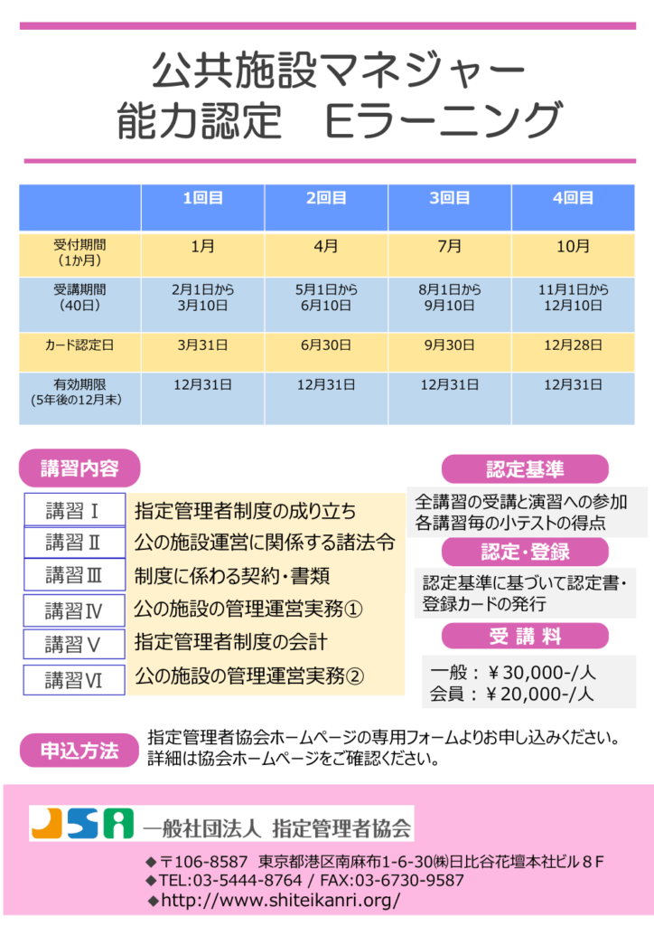 公共施設マネジャー 能力認定 Eラーニングを年に4回開催しております。